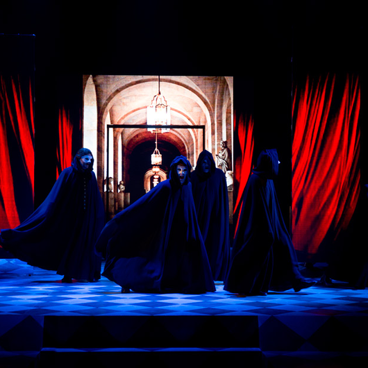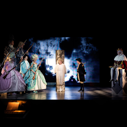 Drottningens juvelsmycke är en av den svenska litteraturens stora klassiker. Denna moderna bearbetning bjuder på en lustfylld lek med identitet och kön, äkthet och förställning. Den är på samma gång en storslagen romantisk saga och en glammig musikteater i 1700-talskostym.